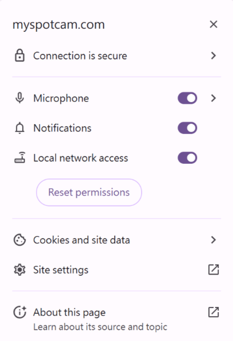 4.To ensure the SpotCam Streaming Service Engine functions properly, if you are using Google Chrome version 142 (October 2025) or later, you must enable “Local Network Access” permission. This allows Google Chrome to connect to the SpotCam Streaming Service Engine on your local device via the local network. If this permission is not enabled, Google Chrome may block local network connections, causing the streaming service engine to fail to start or preventing video from playing properly.